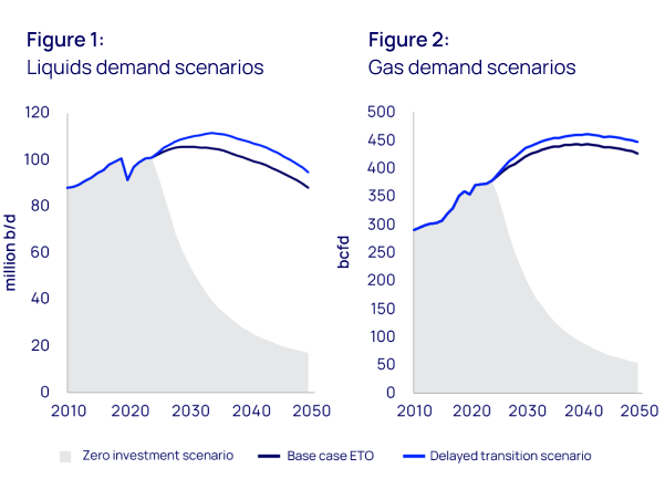 However, the implications of a delayed energy transition would be very significant. Our delayed transition scenario assumes a five-year delay to global decarbonisation efforts. This would result in a 3 ºC pathway requiring 5% more oil and gas supply. Liquids demand would average 6 million b/d (6%) higher than our base case to 2050, and gas demand would average 15 bcfd (3%) higher than our base case.