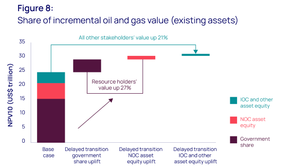 The incentives to support investment would be strong. US$100/bbl translates into incremental government tax revenues and direct national oil company (NOC) equity interests of US$6 trillion, and a US$1 trillion increase in corporate valuations, just for existing commercial assets (on an NPV10 basis).