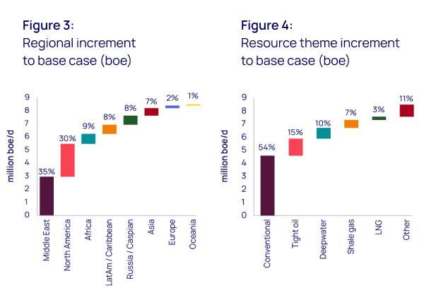 As with previous upcycles, supply from the rest of the world would creep up relative to our base case. Key contributors to the final 30% of additional supply include Latin America and Africa’s deepwater sectors, while Russia and the Caspian, Asia Pacific and Europe would also produce more than our current forecasts.